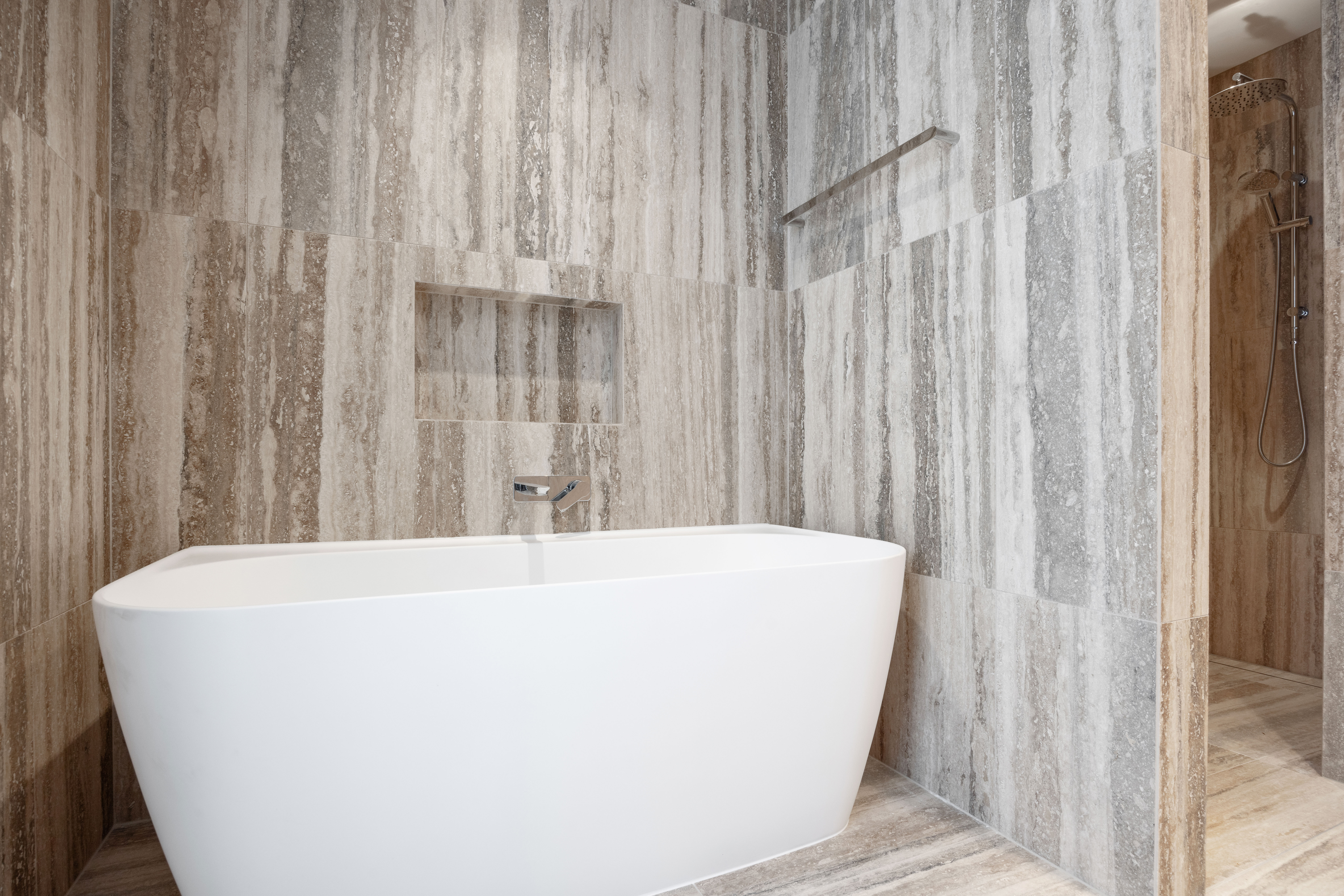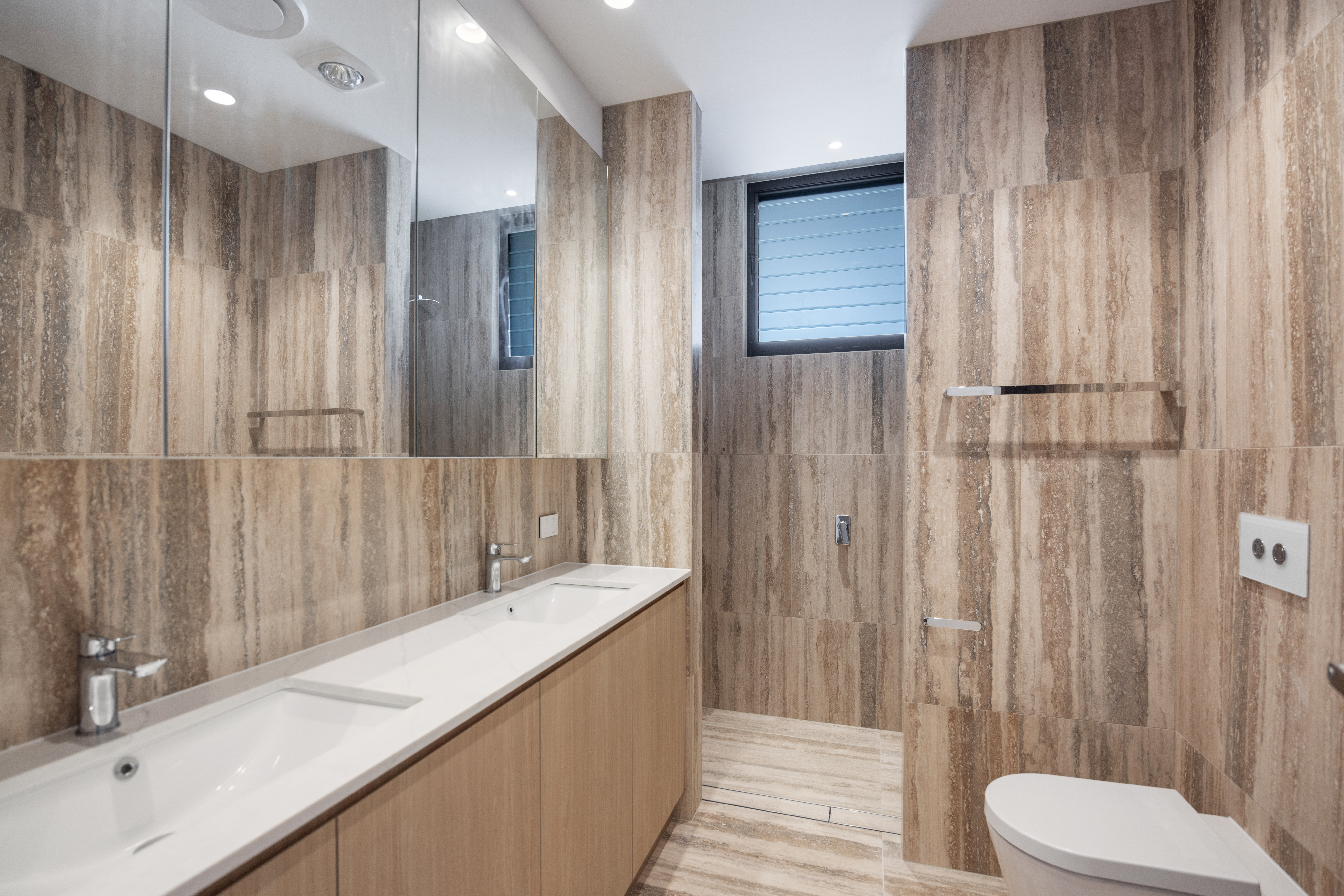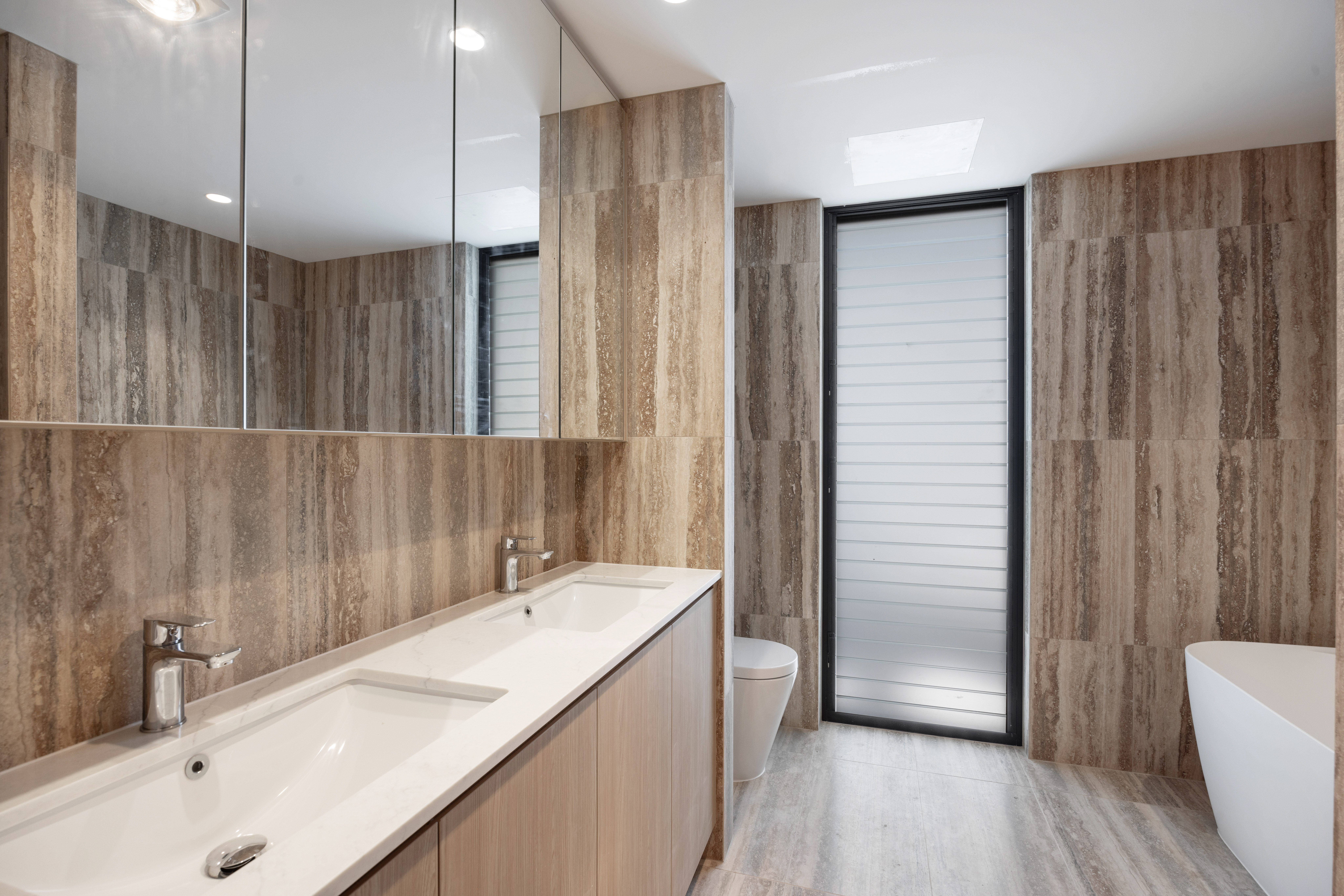 Bedrooms 2 and 3 are both double sized with ceiling fans, built-in robes and feature their own unique garden aspects with terraces access available via bedroom 3. Bedrooms 2 and 3 share a main bathroom and it's certainly extravagant in size with the quality finishes to match. The bathroom will feature a large shower and stone bathtub, with a view of the garden terrace through louvre windows. There will also be a spacious vanity, large mirror and floor to ceiling tiles.