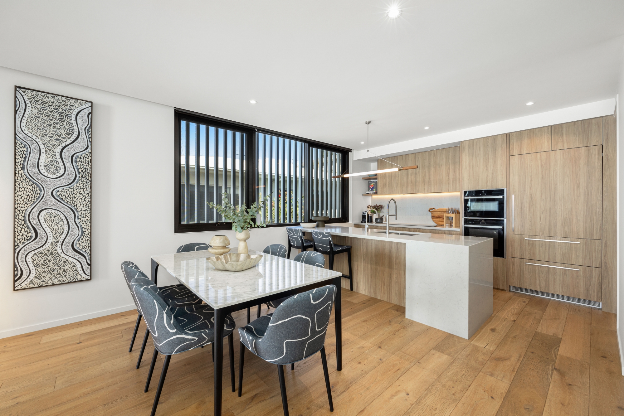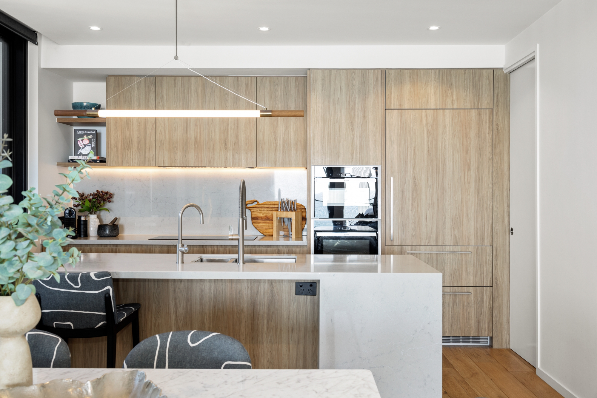 Designed by renowned architect Ellivo, a range of premium features are incorporated, including a Zip hot/cold tap, a built-in wine fridge, integrated Liebherr fridge and freezer, integrated dishwasher, NEFF convection/microwave/grill/steamer, NEFF oven with slide-and-hide feature, upgraded pendant lighting, Crimsafe security doors, motorized blinds, Sonos sound system, master ensuite with double shower, heated floor and towel rail, Royalet toilet, Italian shower screen, ceiling heater, and extra shelving throughout all storage areas in the home.