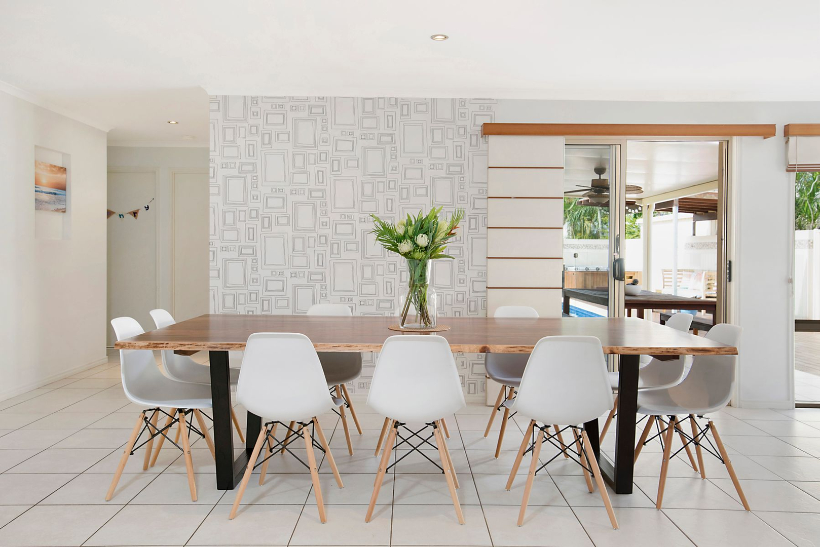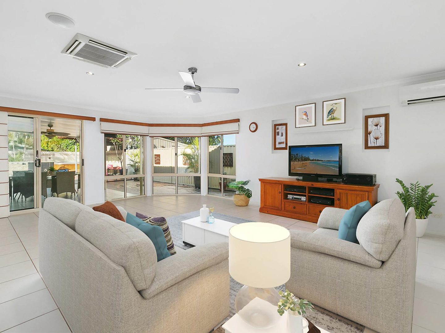 The living space seamlessly connects to a covered alfresco entertaining area which overlooks the pool.