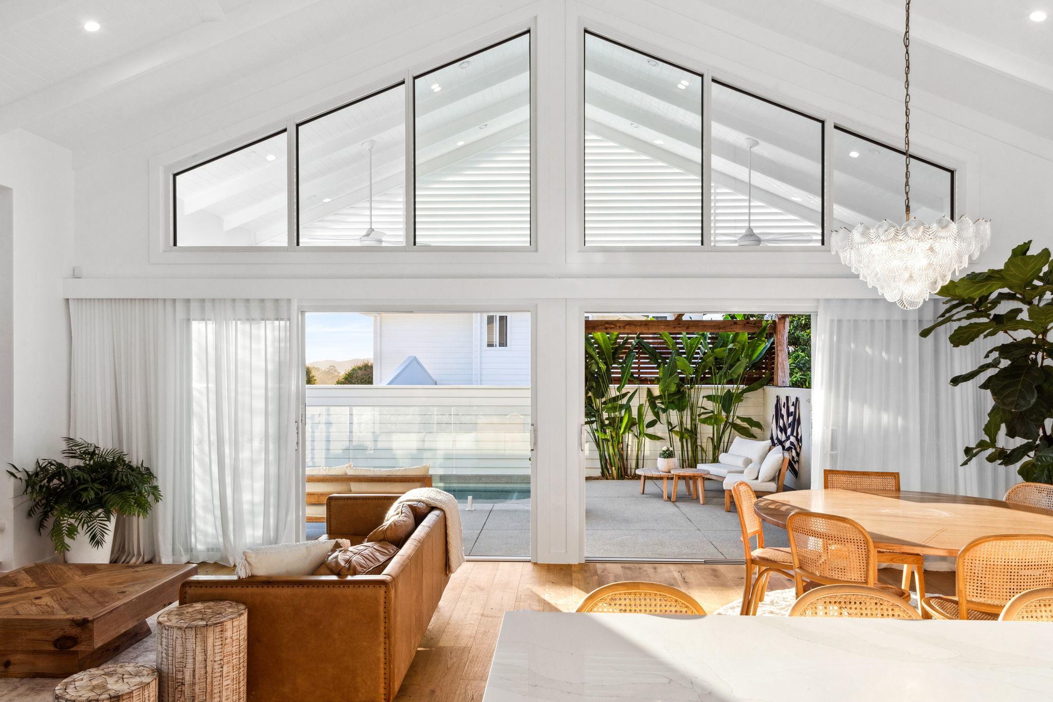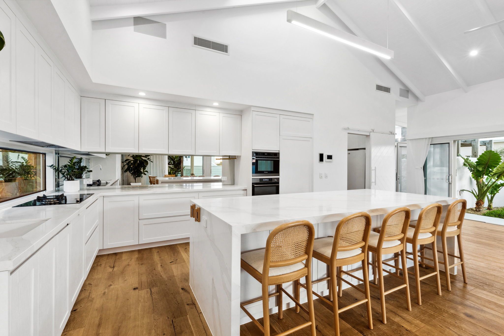 The gourmet kitchen is the heart of the home, featuring Caesarstone benchtops, gas and induction cooking, a built-in steam oven, air fryer, microwave, and a self-cleaning pyrolytic oven. A Butler's pantry, laundry, and bathrooms are also adorned with high-end 2pac cabinetry and Caesarstone finishes, adding a touch of sophistication.