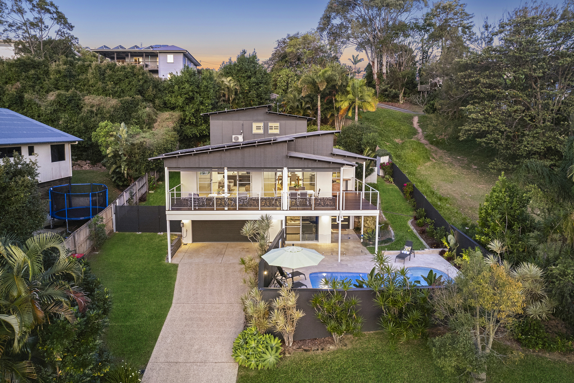 - Magnificent family home with show-stopping sunset and hinterland views - A spacious floorplan with 3 bedrooms, 2 bathrooms and a double garage - Open plan living and dining area with high ceilings, flows onto large deck area