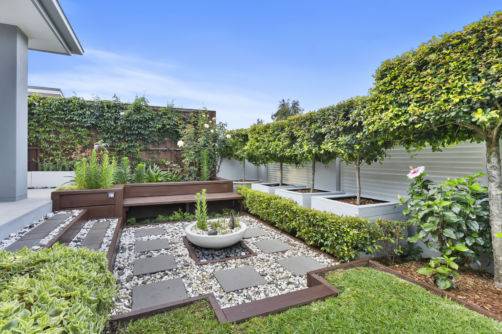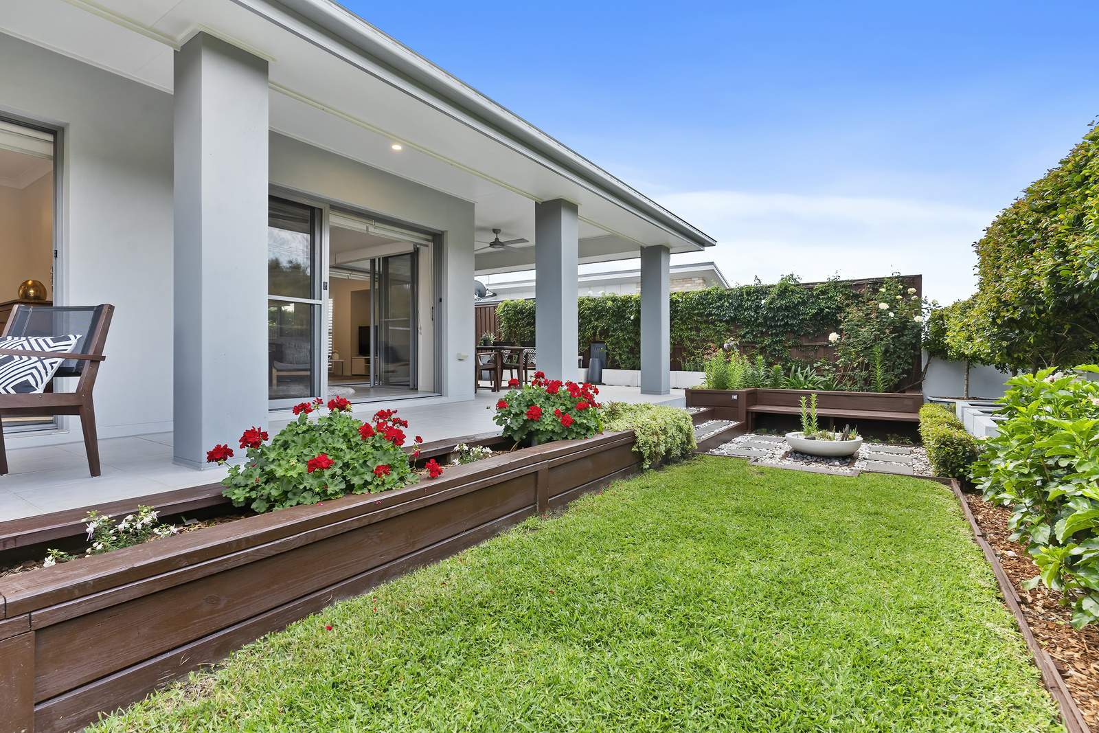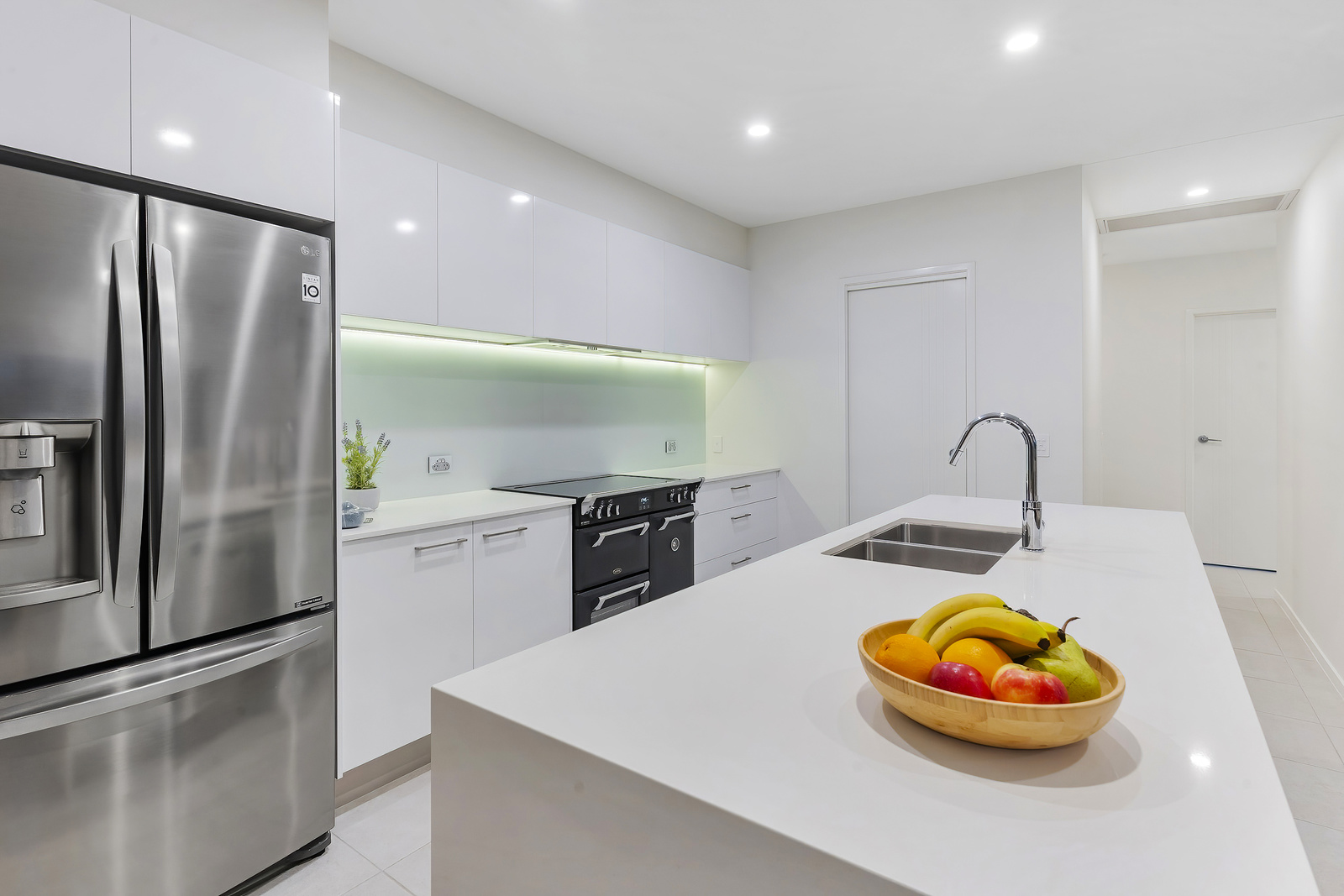 The gourmet kitchen is a chef's delight and features high-end appliances, stone benchtops, a glass splashback and a walk-in pantry.