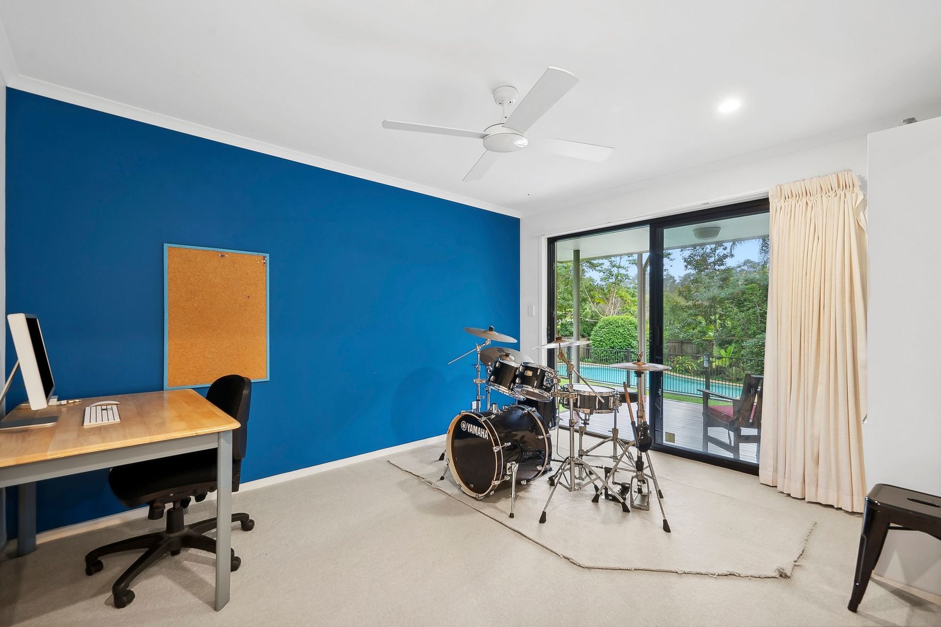 The open plan living, dining, and kitchen area serves as the heart of the home, seamlessly extending to an undercover wrap-around deck. This north-facing outdoor space overlooks an oversized pool, manicured lawns, and majestic tall gums that catch the sunlight beautifully. The sounds of local bird life enhance the sense of being at one with nature.