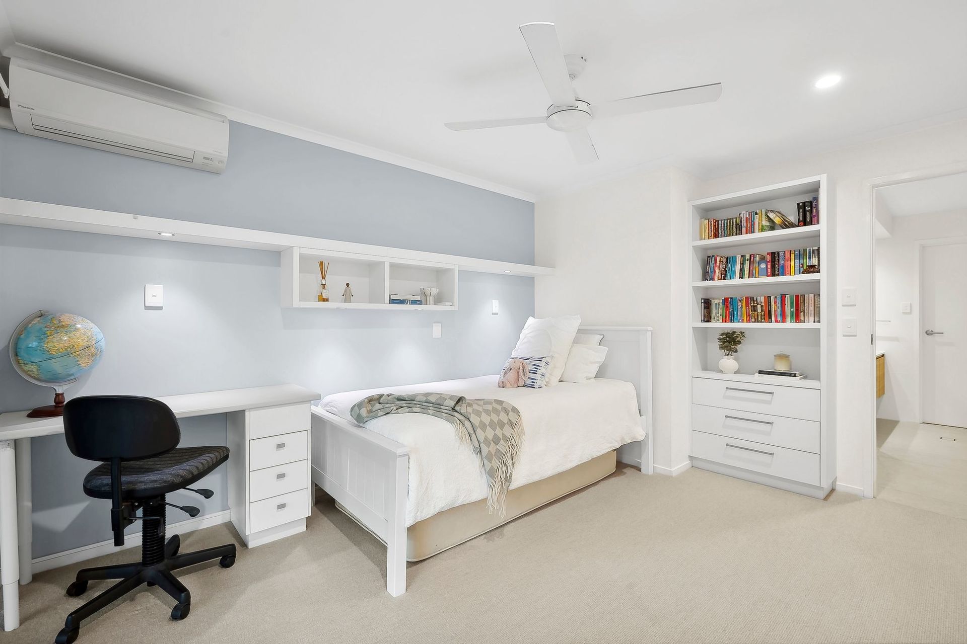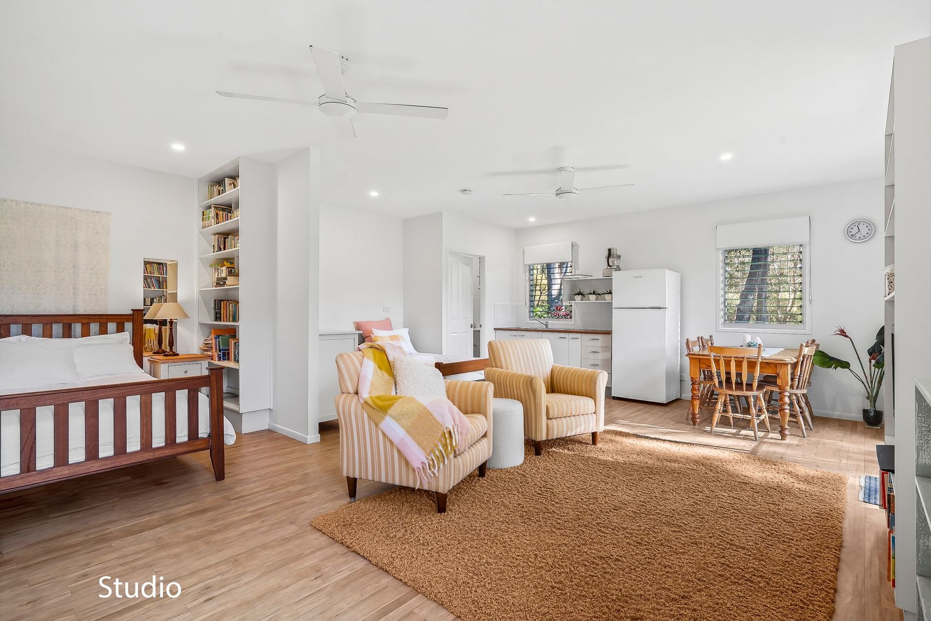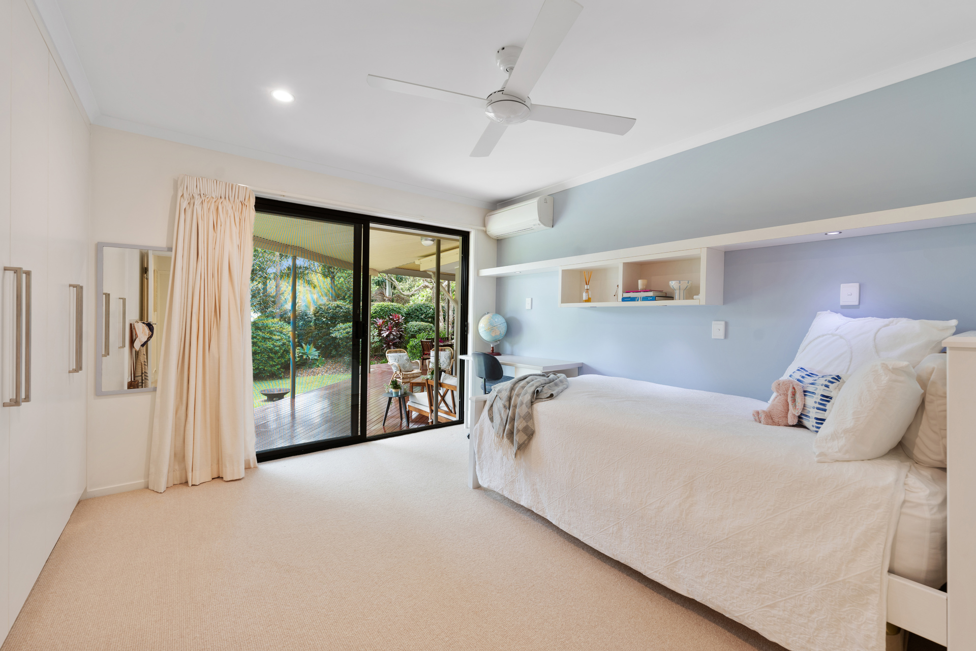 Built in 2000 with renovations in 2018. 6 bedrooms with self-contained studio and flexible nursery/study. High ceilings, square set cornices, tall skirtings. Commercial gas cooktop and range hood. Miele oven and Bosch dishwasher. Large walk-in pantry with extensive shelving and stone tops. Crimsafe windows. Multiple louvres promote cross breezes and cooling air flow. High strength Vacumaid system throughout. Split system air conditioning to all rooms. Ceiling fans throughout – noiseless BIGASS brand in living room. Frameless glass in all showers, top quality tap fittings and sinks. NZ Cavalier Bremworth wool carpets. In built laundry hampers x 3. Laundry shute from upstairs master bathroom. Custom made American oak bar stools made to fit. 2nd living area/media room with custom oak entertainment unit. Top quality Norman brand plantations shutters, water resistant. Imported Italian porcelain tiles throughout. NBN Fibre to the node. Extra power points in every room. Studio has air conditioning, kitchenette, bathroom and Tv aerial.