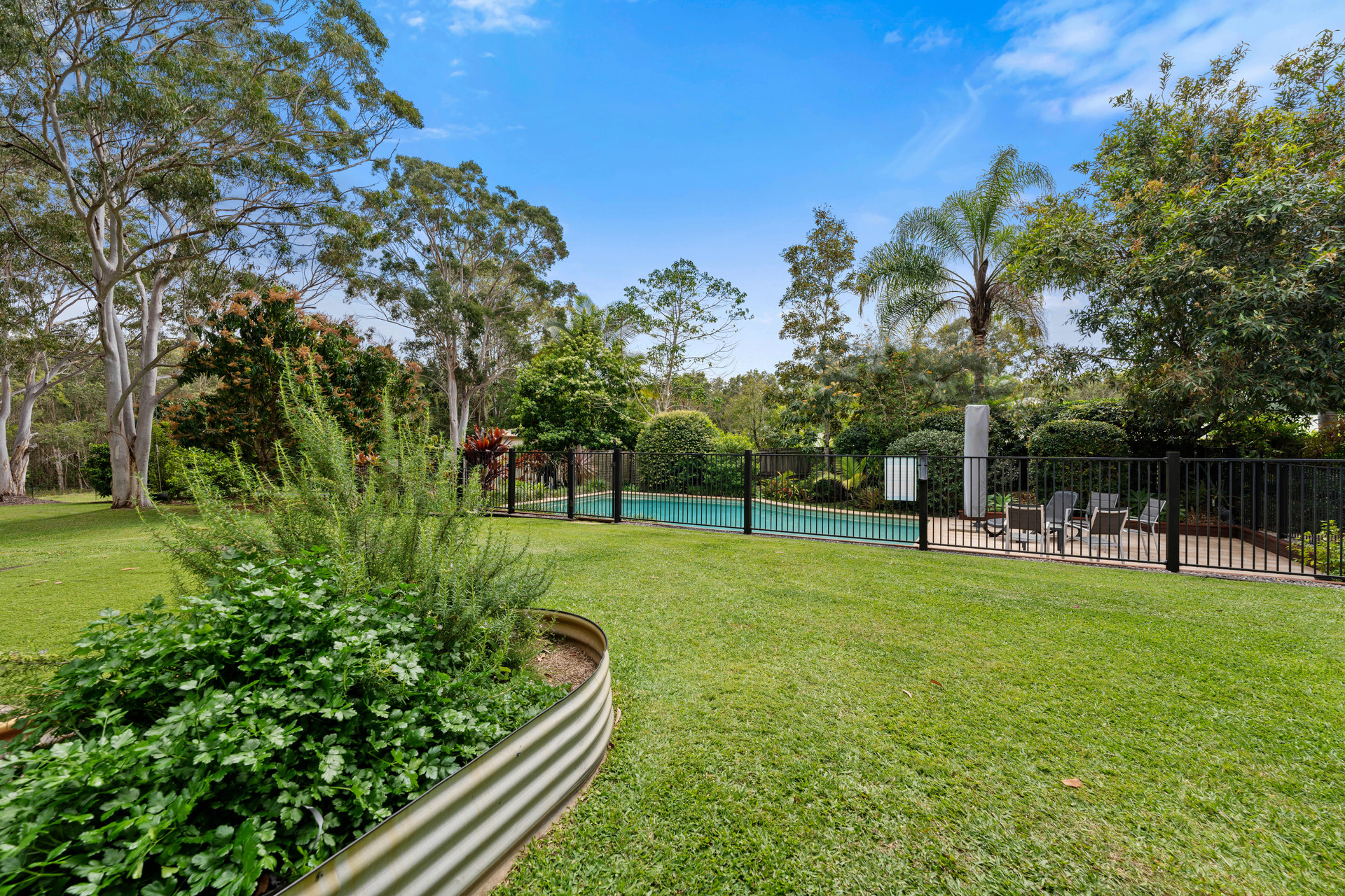 North facing over the pool. Northwest at the rear of the property, ensuring delightful sunsets. Saltwater pool 11 by 6, 100,000 litres, granite coping and surrounds. 70,000 litres of tank water. Bore pump. Fruit trees, lemon, mandarin, mangoes and oranges. Herbs and seasonal vegetables. Impressive wrap around north facing deck with 3 sections for outdoor living. Shed has one garage door oversized (manual lock up) + 1 auto with tool bench. Ride on mower included. Inspect by private appointment.
