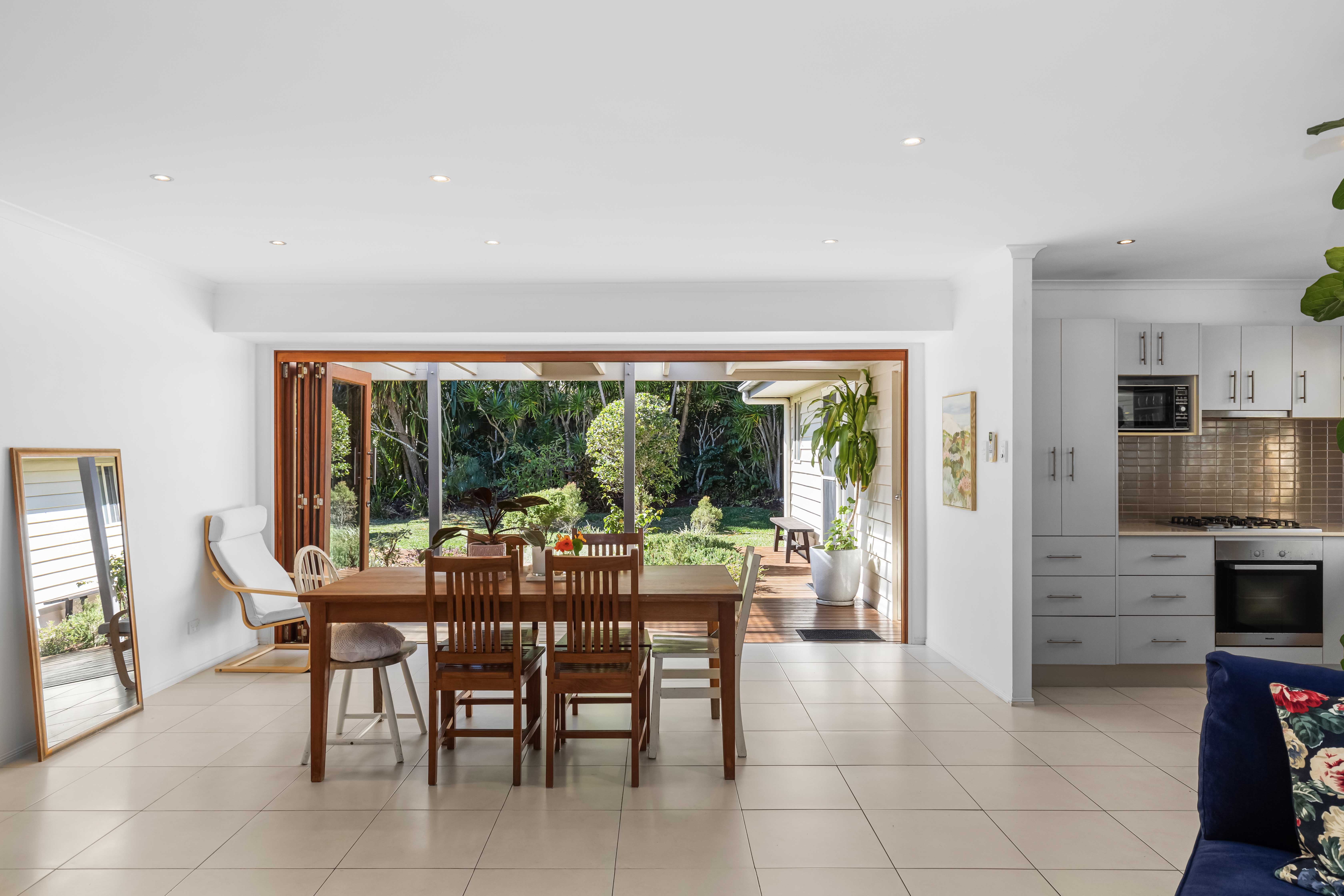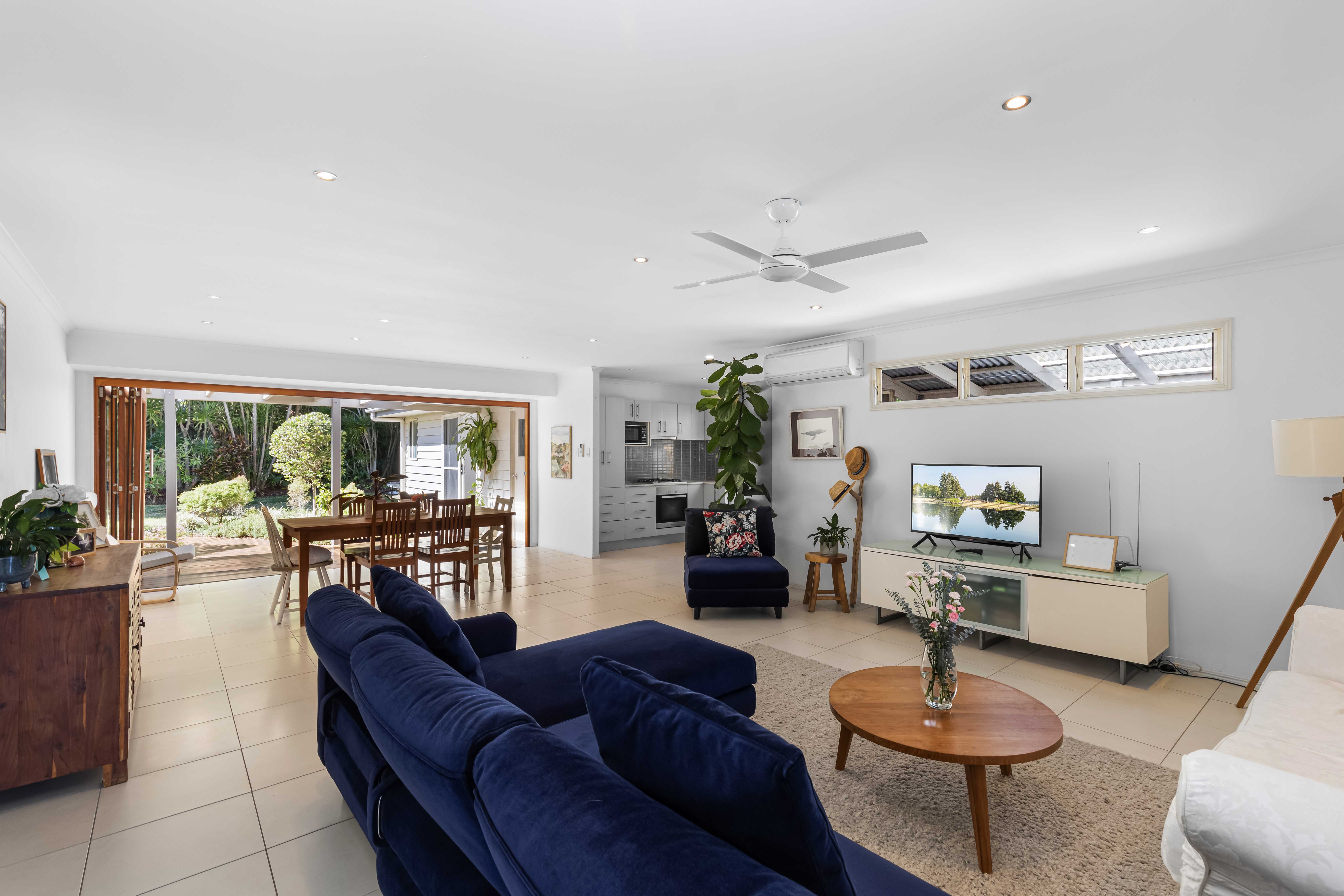 The living area is open plan with tiled floors, combining the kitchen, dining and living area. A large timber bi-fold door opens the living area up to a veranda and decked pathway to a separate alfresco space overlooking the garden. At the front of the home there is an 'L' shaped veranda, which is the perfect area for an outdoor lounge and taking in those balmy sunsets.