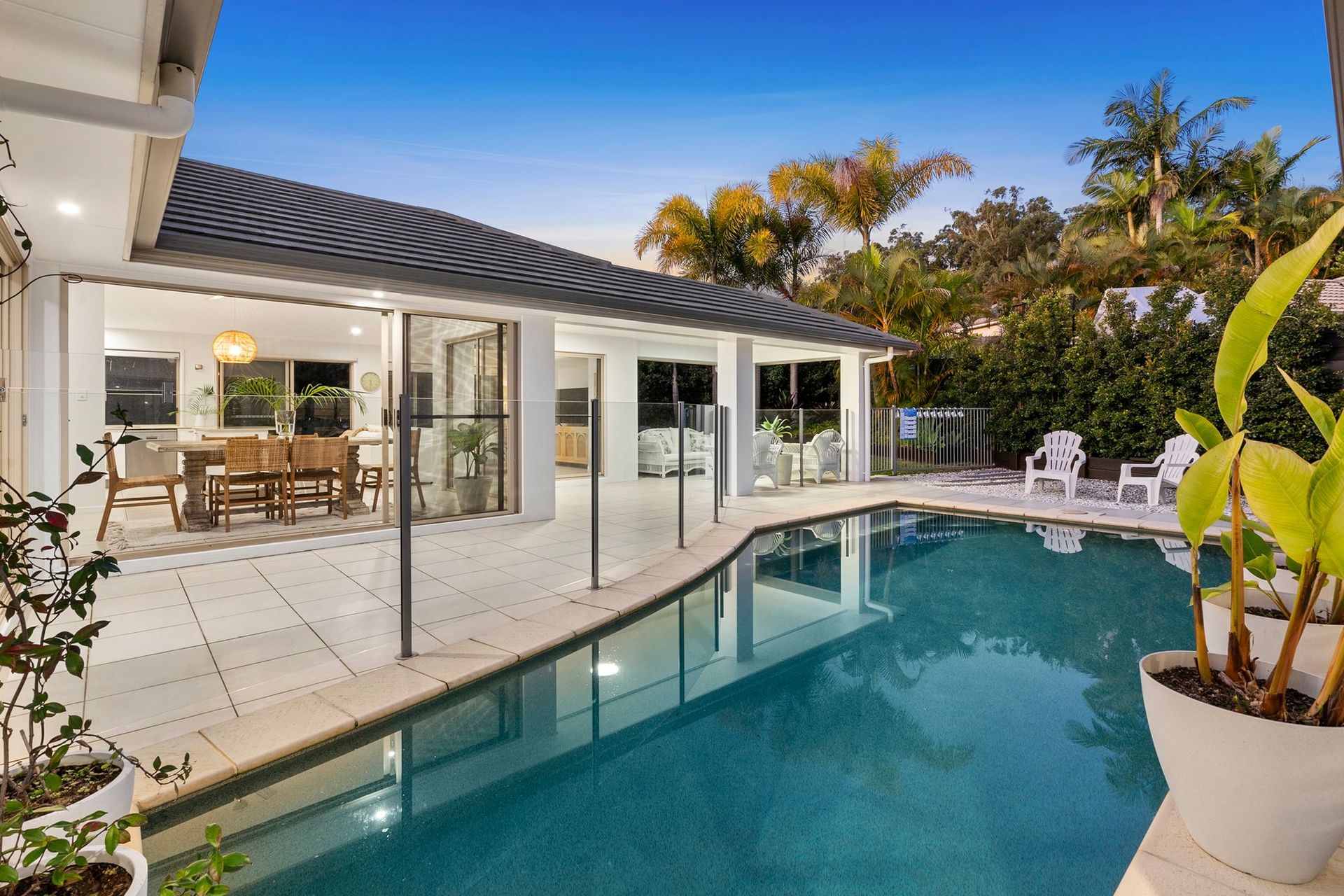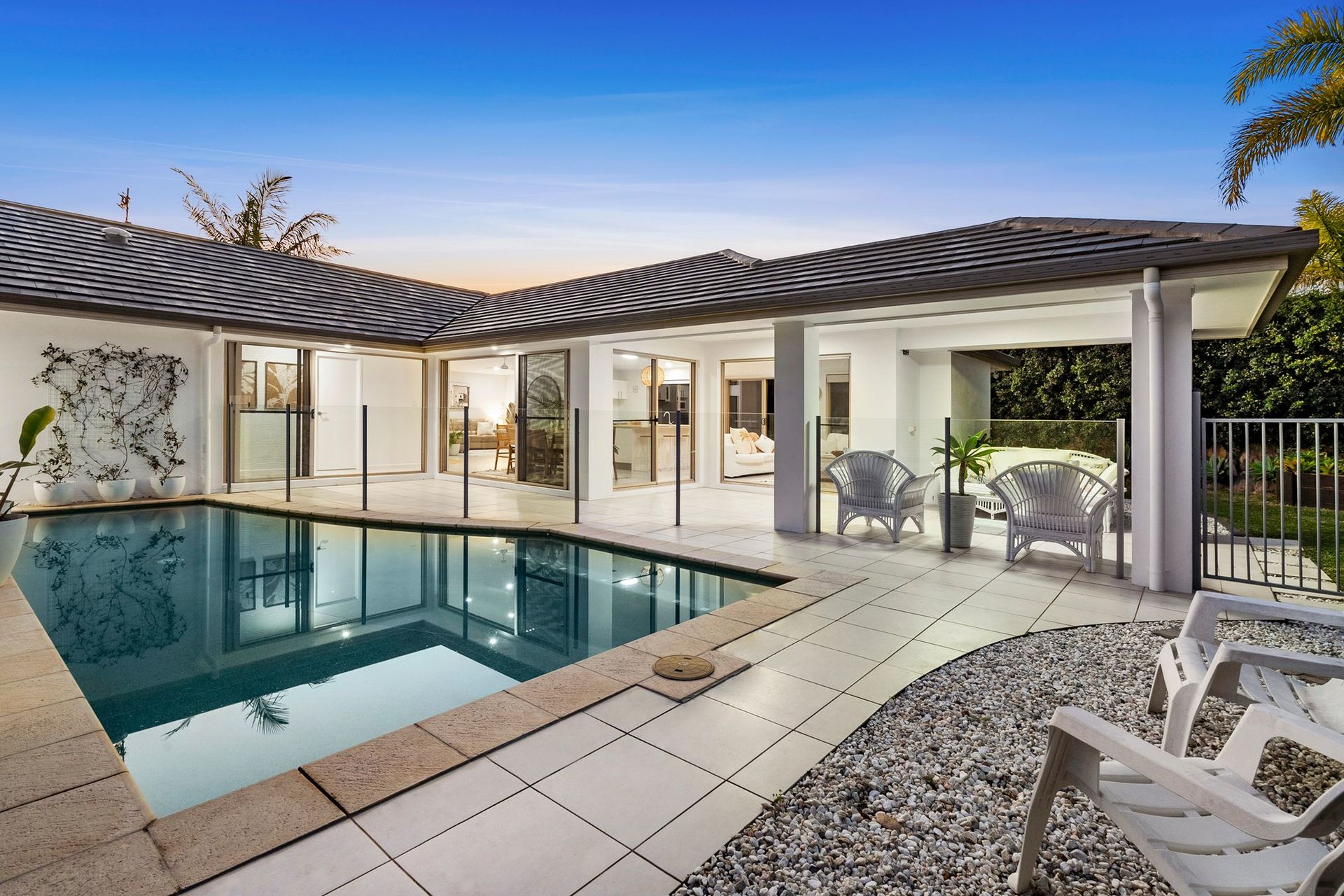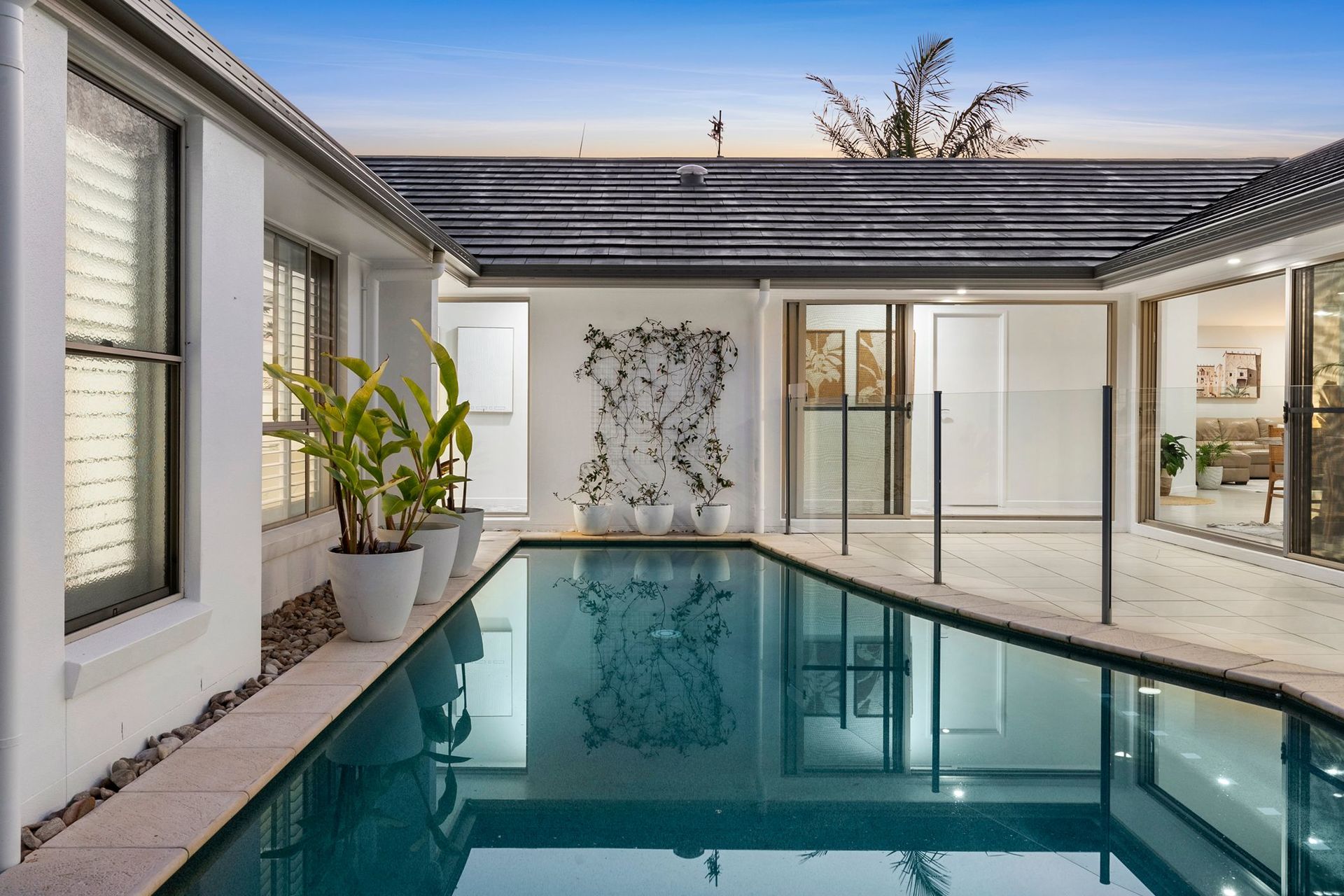 Coastal Oasis A beautiful coastal home in a quiet court, this single-level residence will steal hearts with its pavilion-style design, wrapping around a central pool. Welcome to a private north-facing oasis presenting water outlooks from all angles, stunning natural light, high ceilings, and a relaxed indoor-outdoor flow.