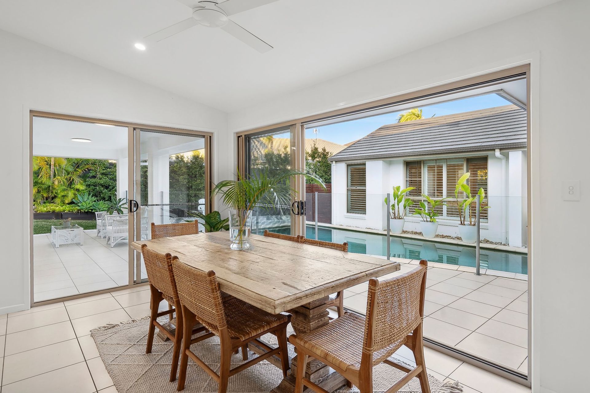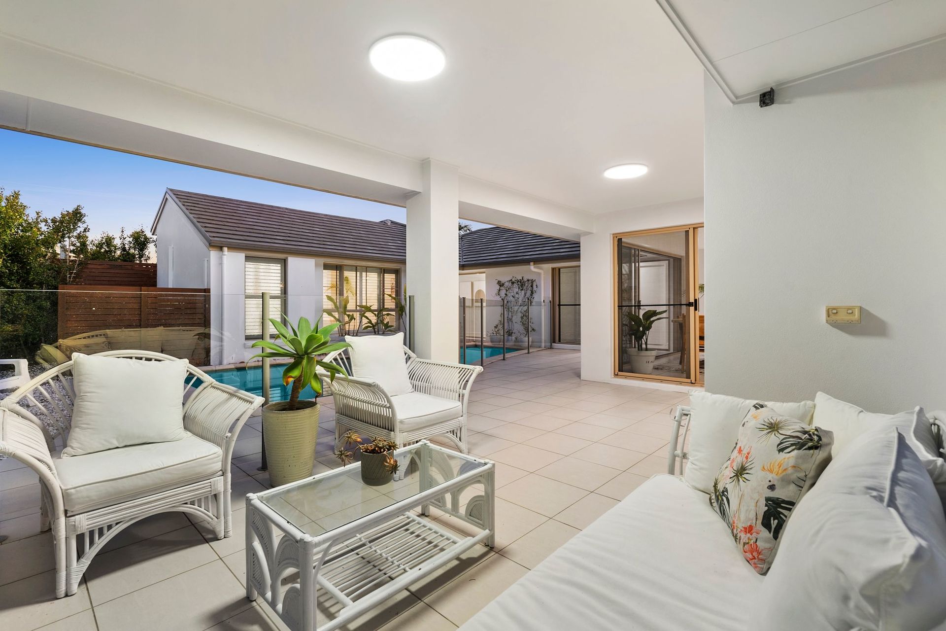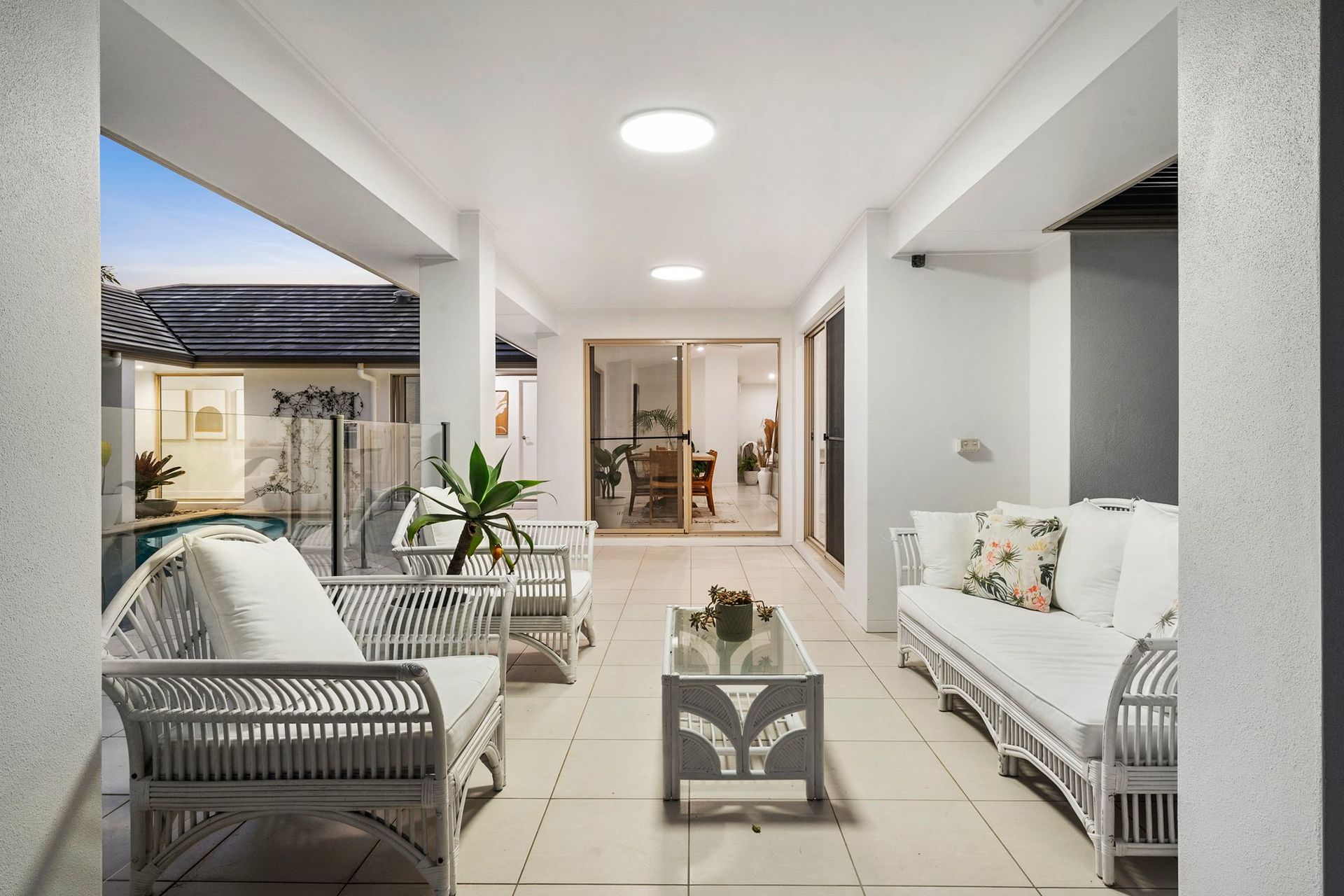 Coastal Oasis A beautiful coastal home in a quiet court, this single-level residence will steal hearts with its pavilion-style design, wrapping around a central pool. Welcome to a private north-facing oasis presenting water outlooks from all angles, stunning natural light, high ceilings, and a relaxed indoor-outdoor flow.
