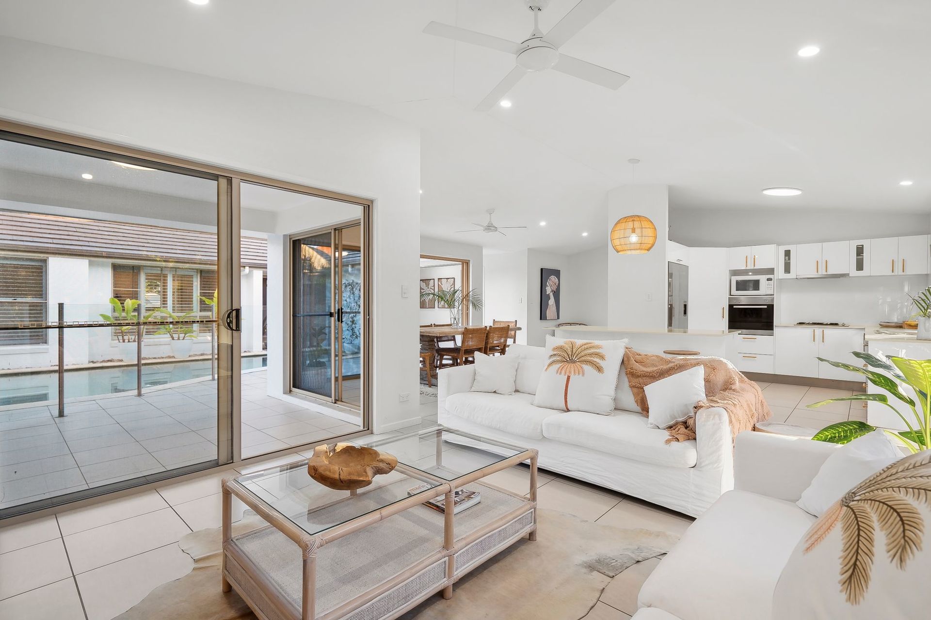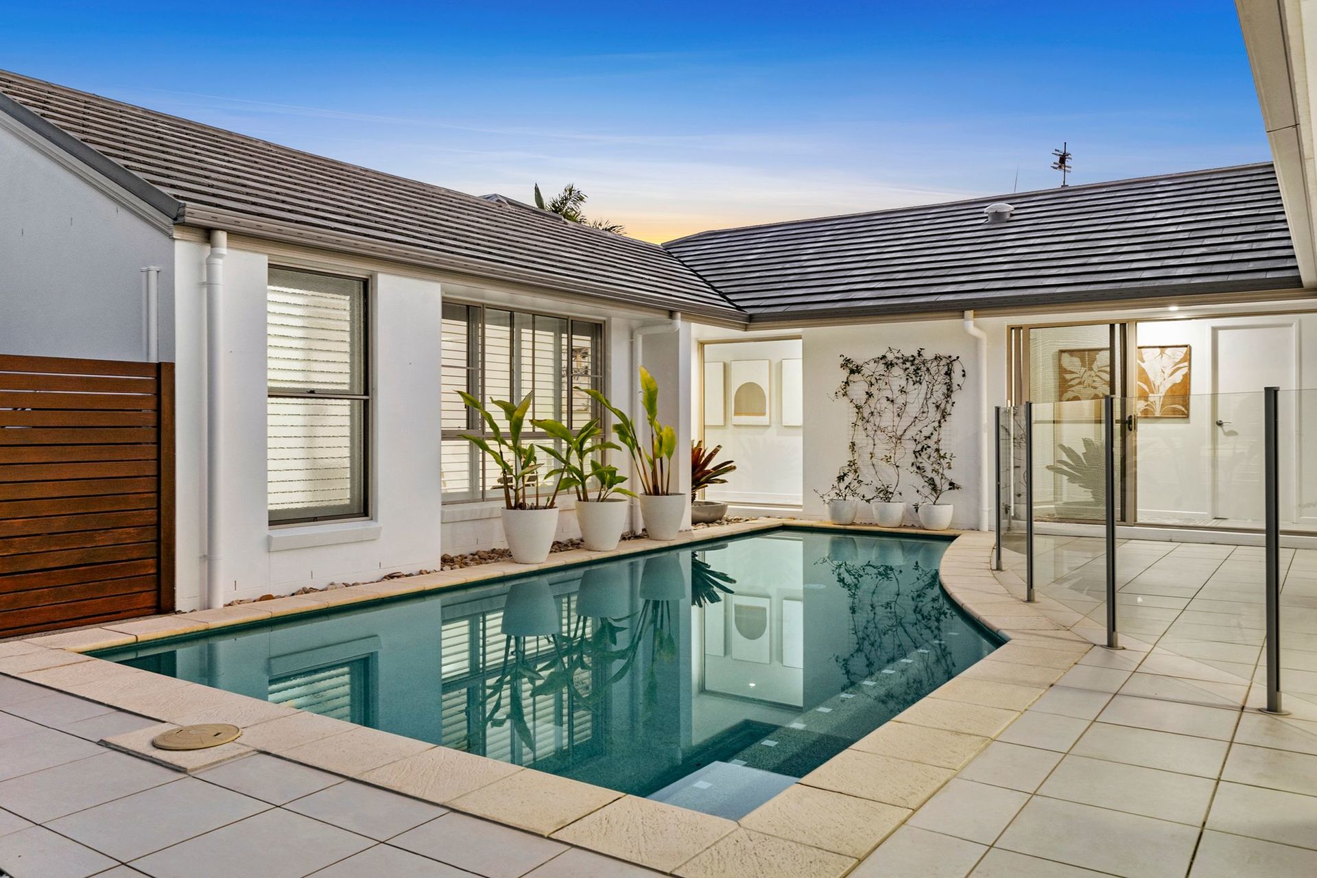 Features Include: - Single-level pavilion-style coastal home, wrapping around a central pool - Private 763m2 (approx) north-facing allotment in a small court with central on-street parking