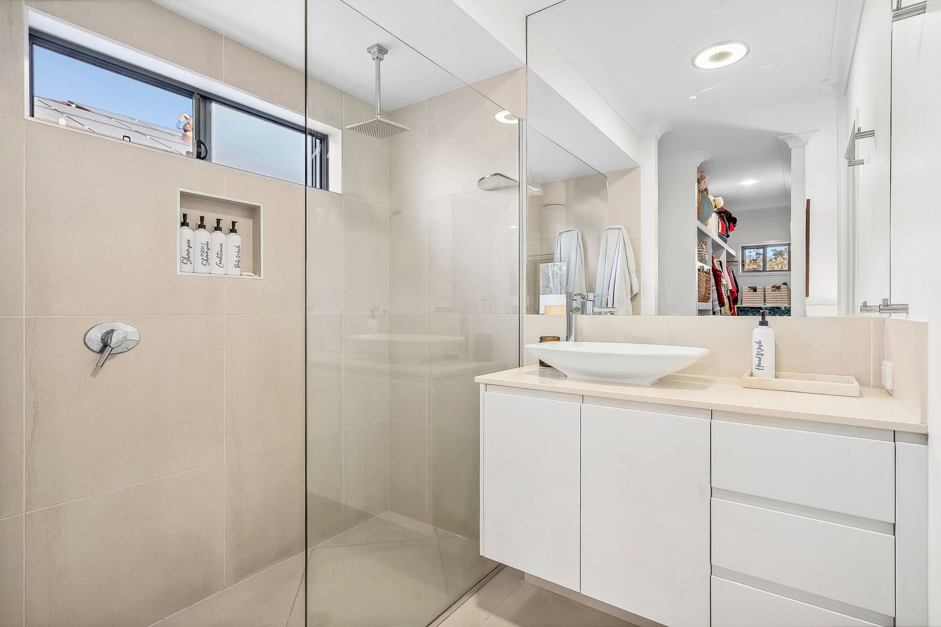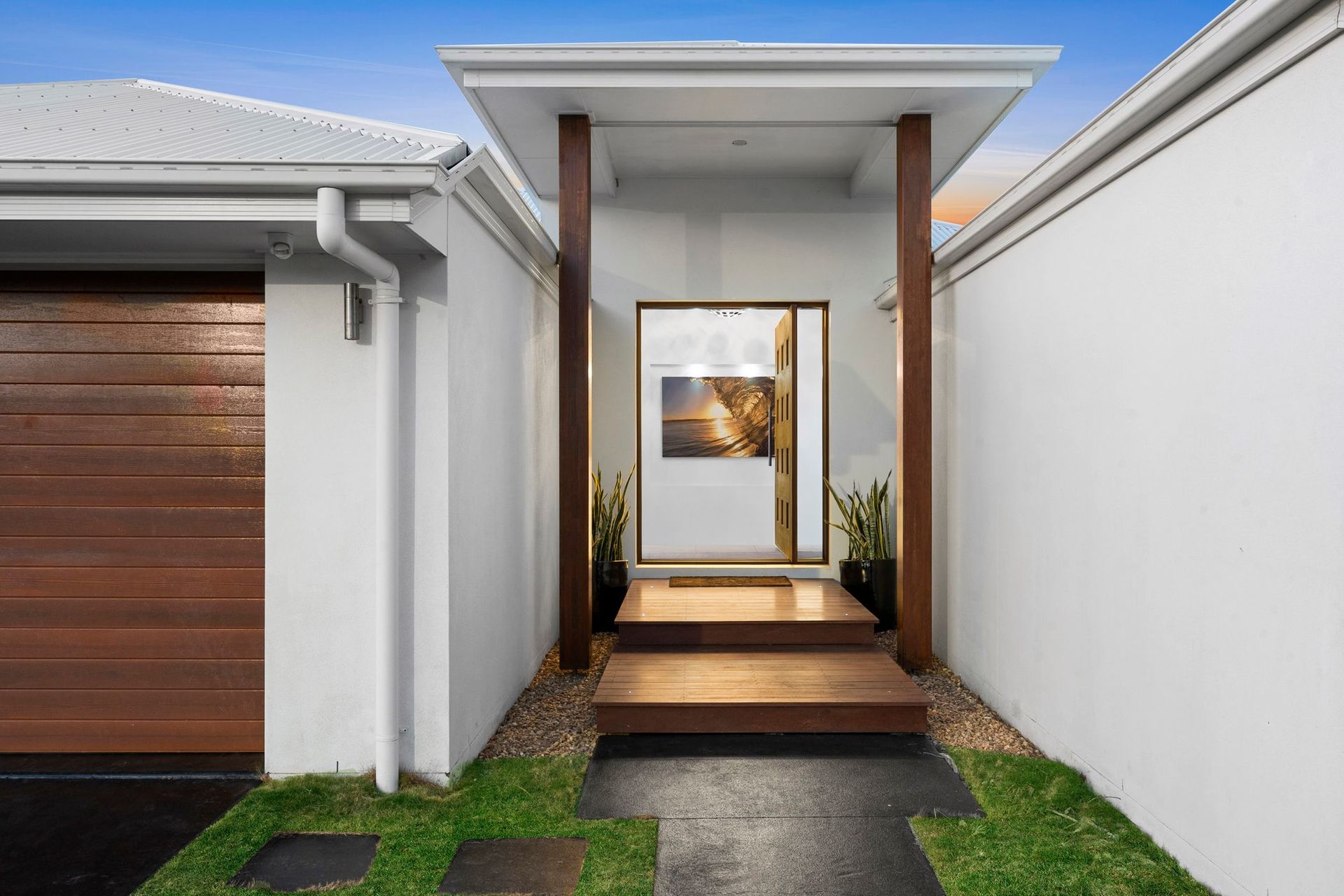 It is a feast for the senses, with a feature entrance, picture-window pool views, a water-view master suite, and a fire pit area with Hamptons porch swing chairs. The home rests on an 806m2 (approx) fan-shaped allotment in the sweep of a crescent, where it enjoys a substantial north-facing garden and no rear neighbours.