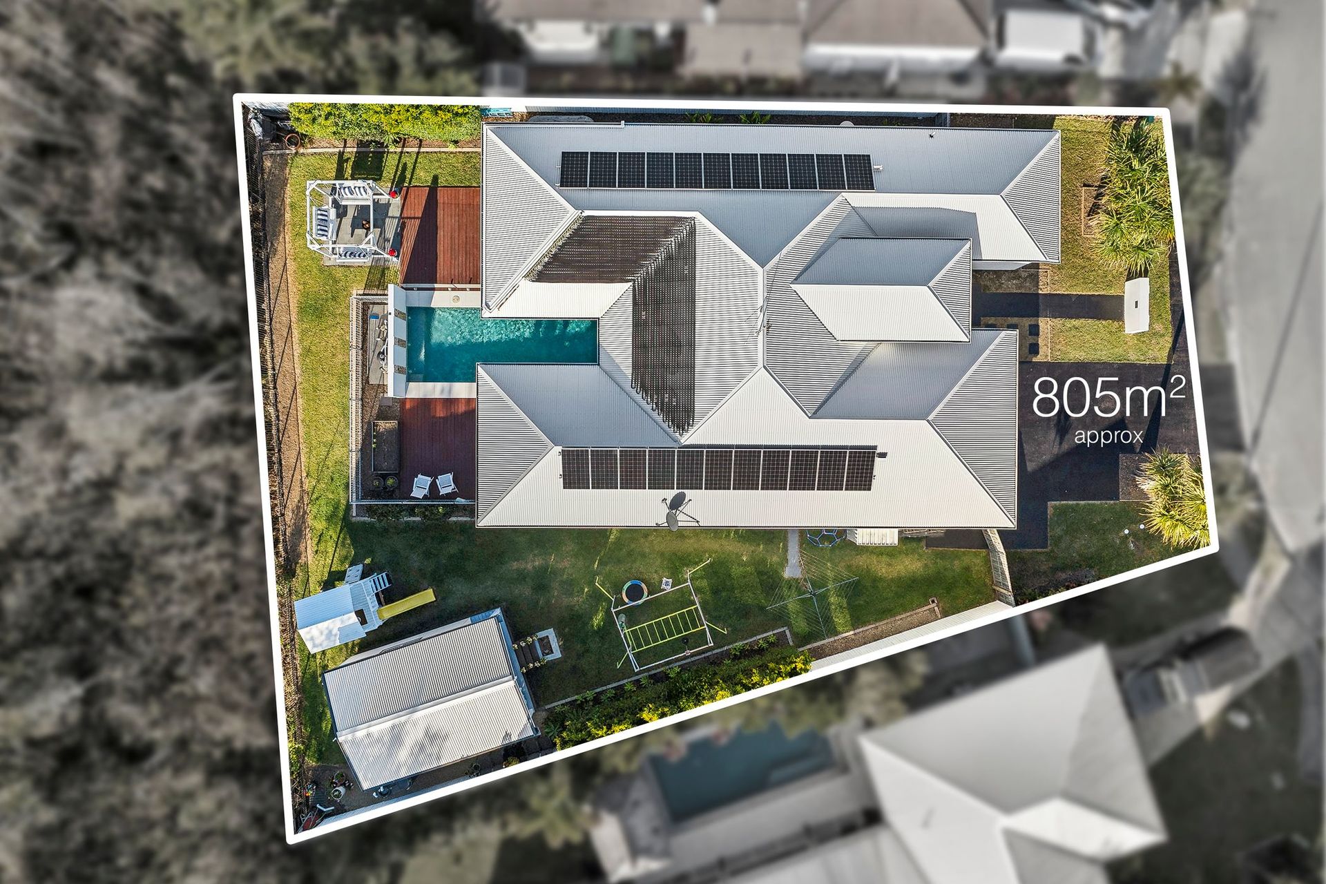 Features Include: - Luxury single-level residence crafted around a salt-chlorinated, solar-heated pool - Large 806m2 (approx) fan-shaped allotment with a substantial north-facing garden - Poolside decking, undercover poolside terrace, and a fire pit area with 3 porch swing chairs - Air-conditioned granny flat with high ceilings, a porch, a kitchenette, and an outdoor area