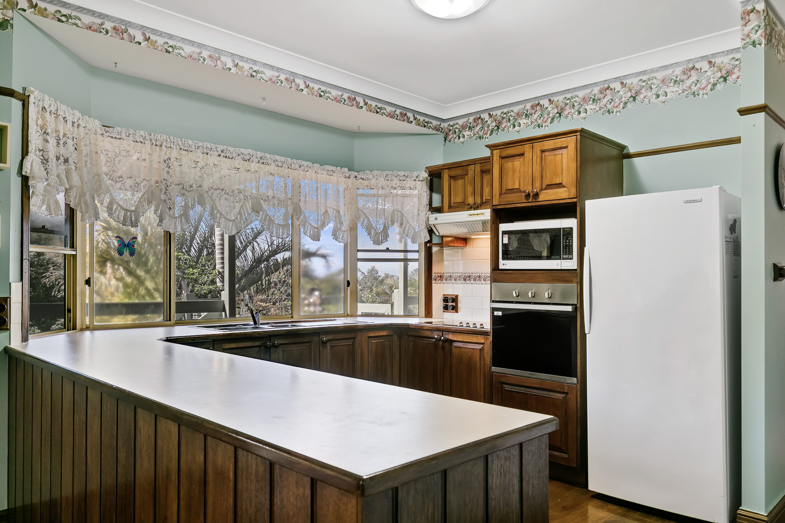 each with built -in robes and with a pleasant leafy outlook, 2 bathrooms and a large kitchen.