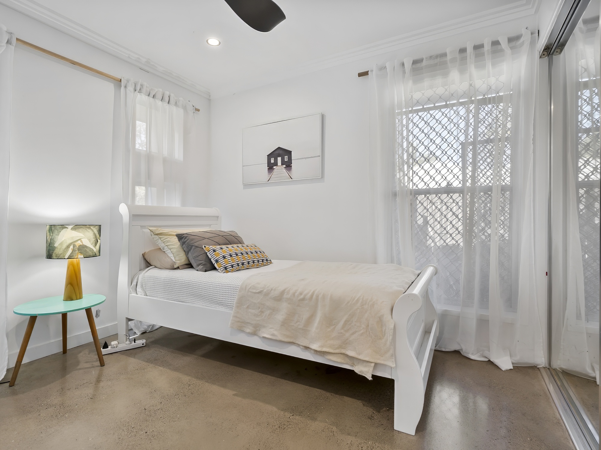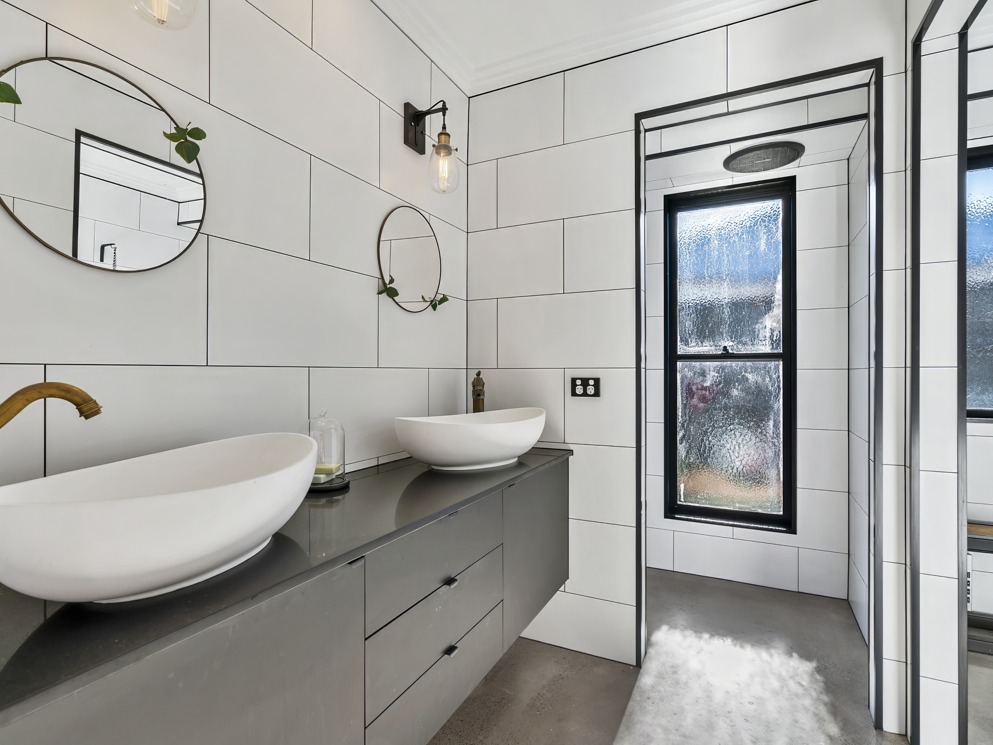 A separate bedroom wing offers privacy and practicality with the remaining bedrooms sharing a spacious family bathroom. A sophisticated black and white palette compliments the soft tones of the concrete and lends to black door hardware and accessories throughout. A second living space/media room adds yet another dimension to this fabulous family home and serves as a further generous space that offers flexibility to this clever design.