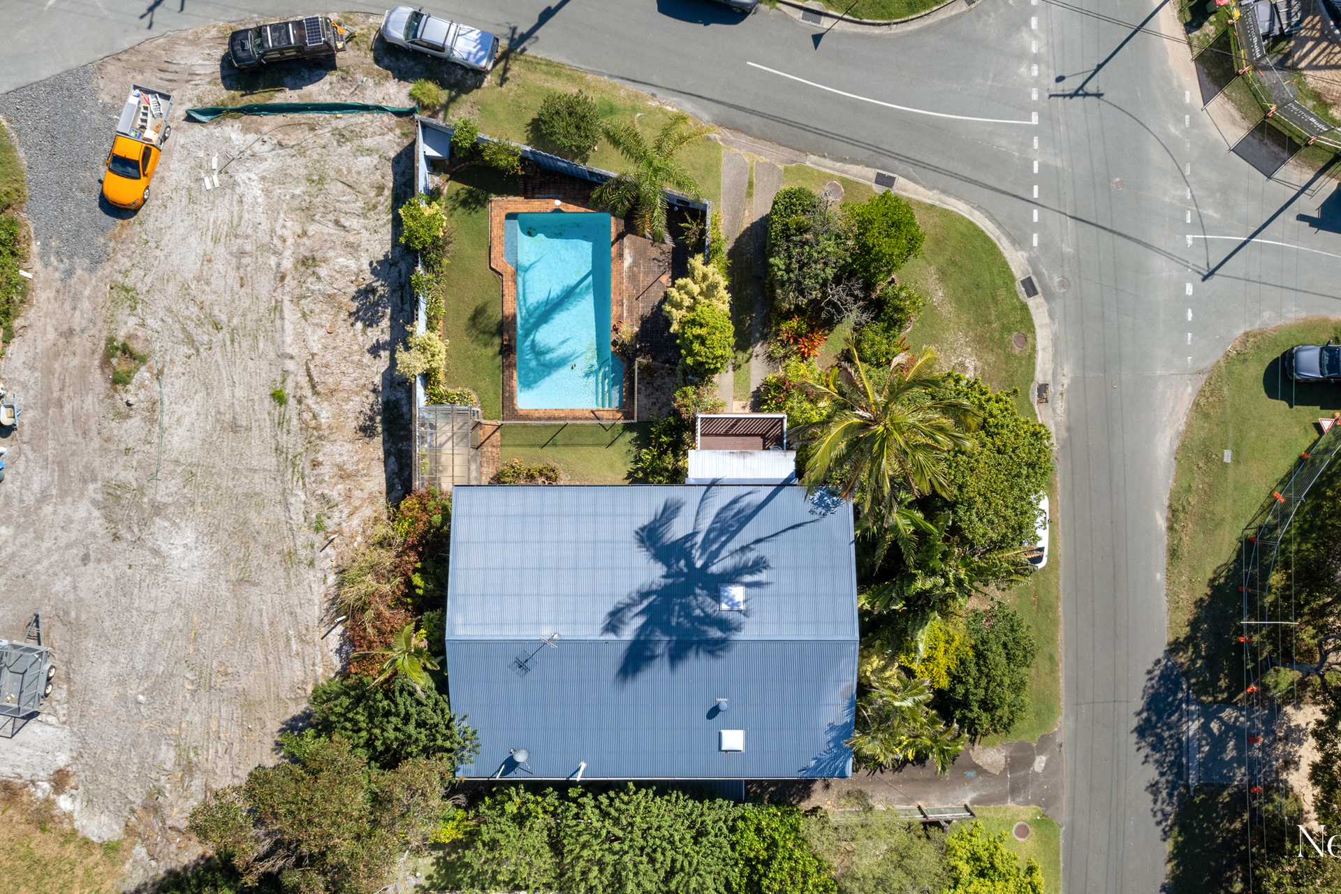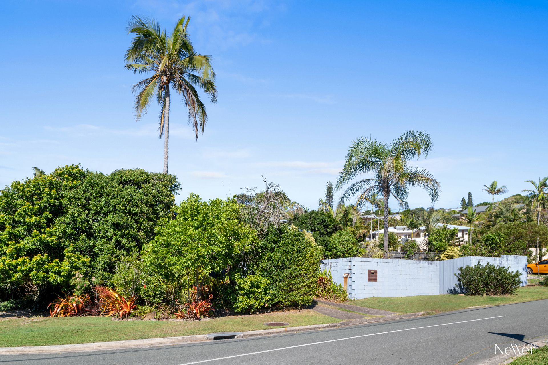 The block has dual street frontage and dual street access, and the front yard is fully fenced; leafy established vegetation provides good privacy on the eastern side with established native and tropical trees and shrubs.