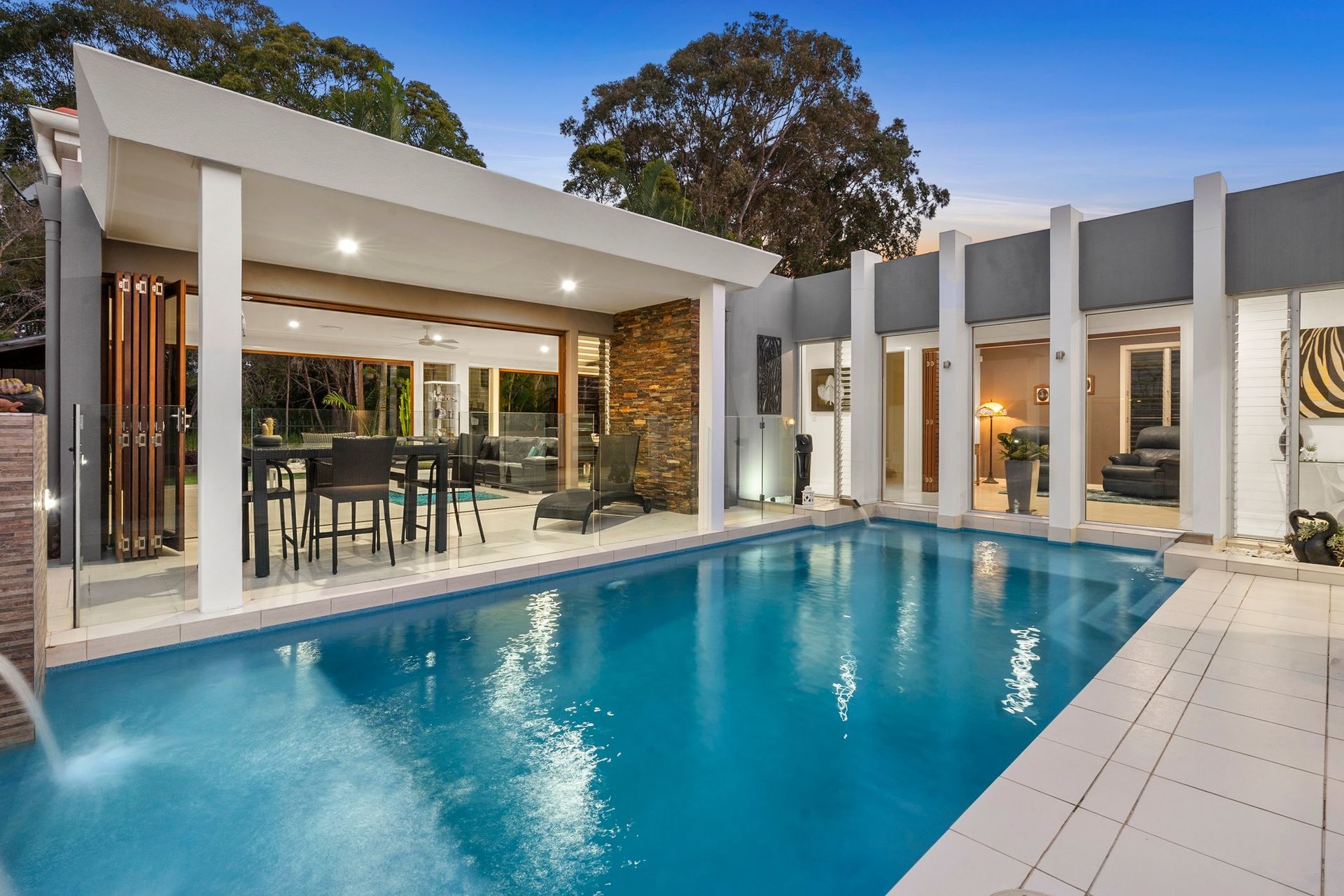 It showcases a U-shaped single-level design that wraps around a large north-facing salt-chlorinated, solar-heated pool with water features and an undercover poolside terrace. Walls of glass, bifold doors, and pool views feature throughout, making this a beautiful summer house, a relaxed entertaining home, and a safe oasis for families with young children.