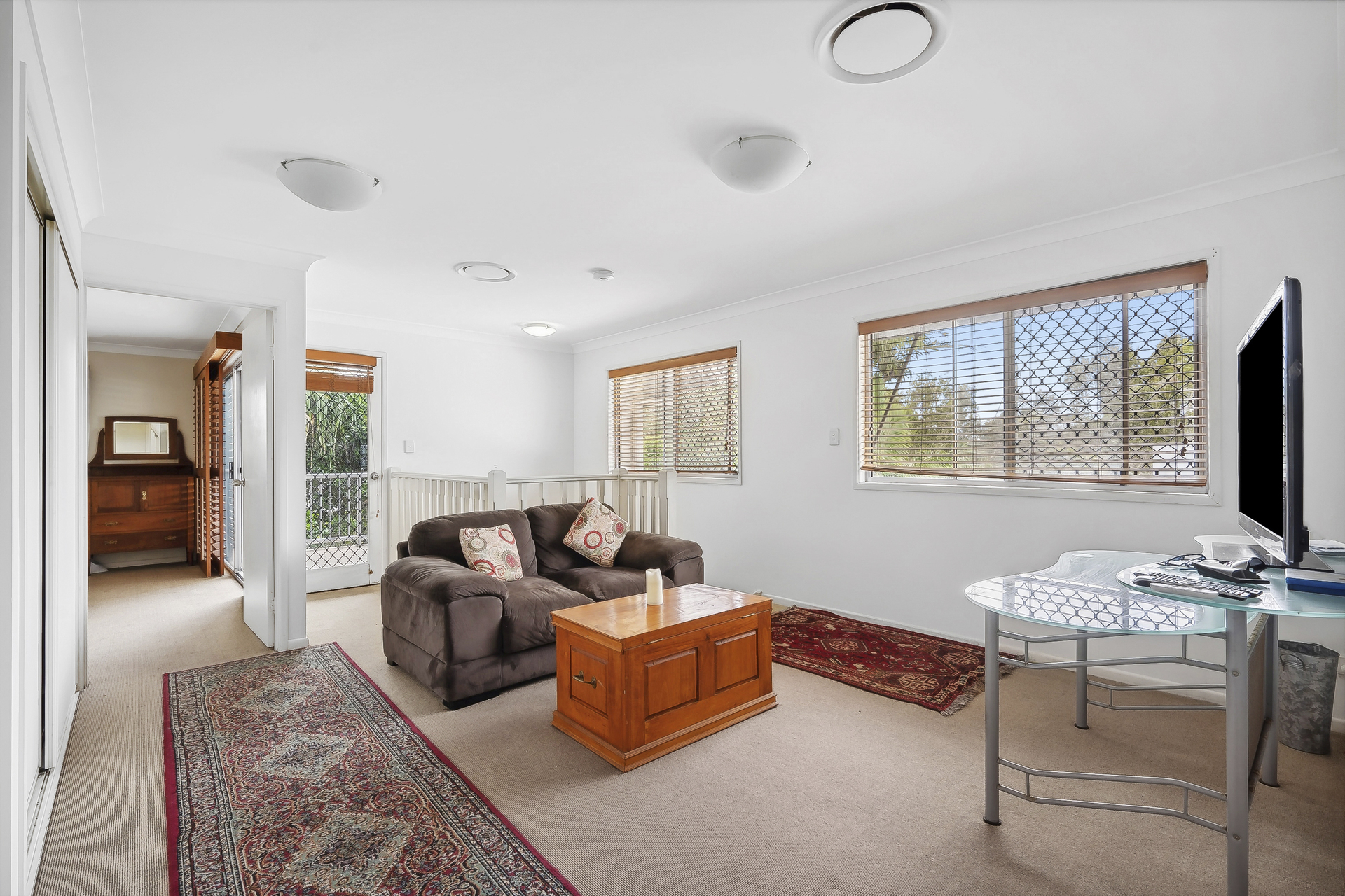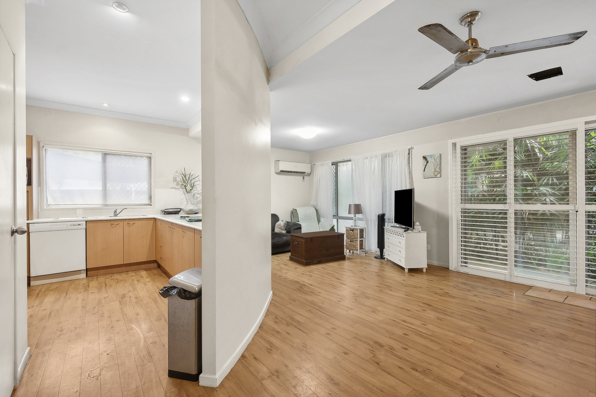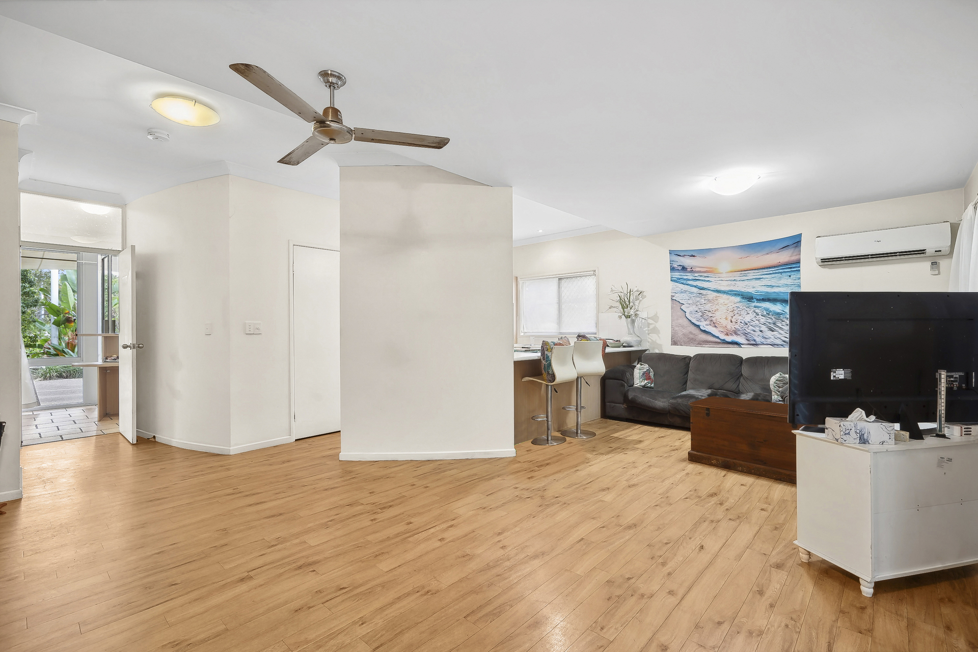 Spread over two levels, this property has air-conditioning throughout. The open-plan design invites renovations, leading to balconies where one can enjoy a sea breeze.