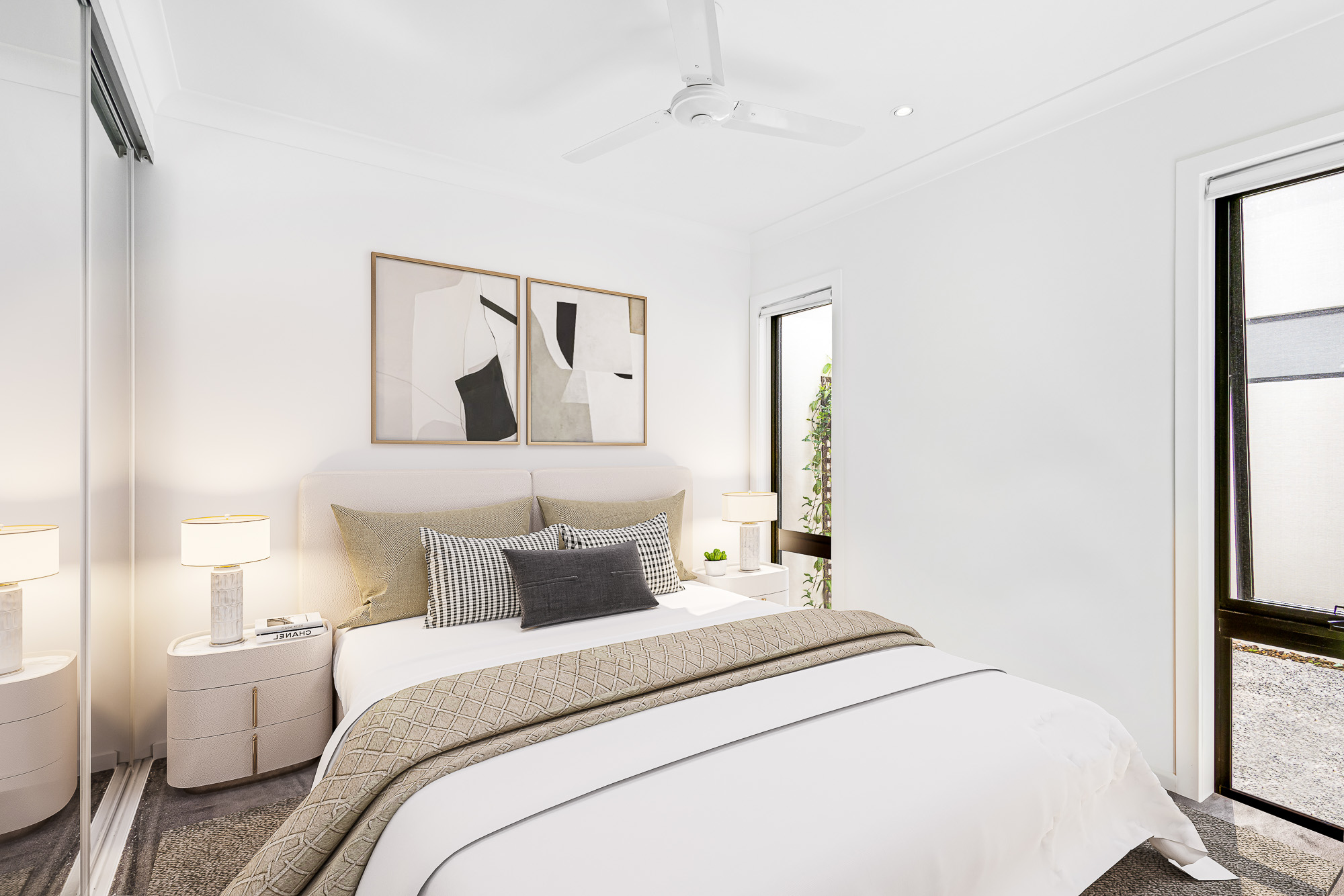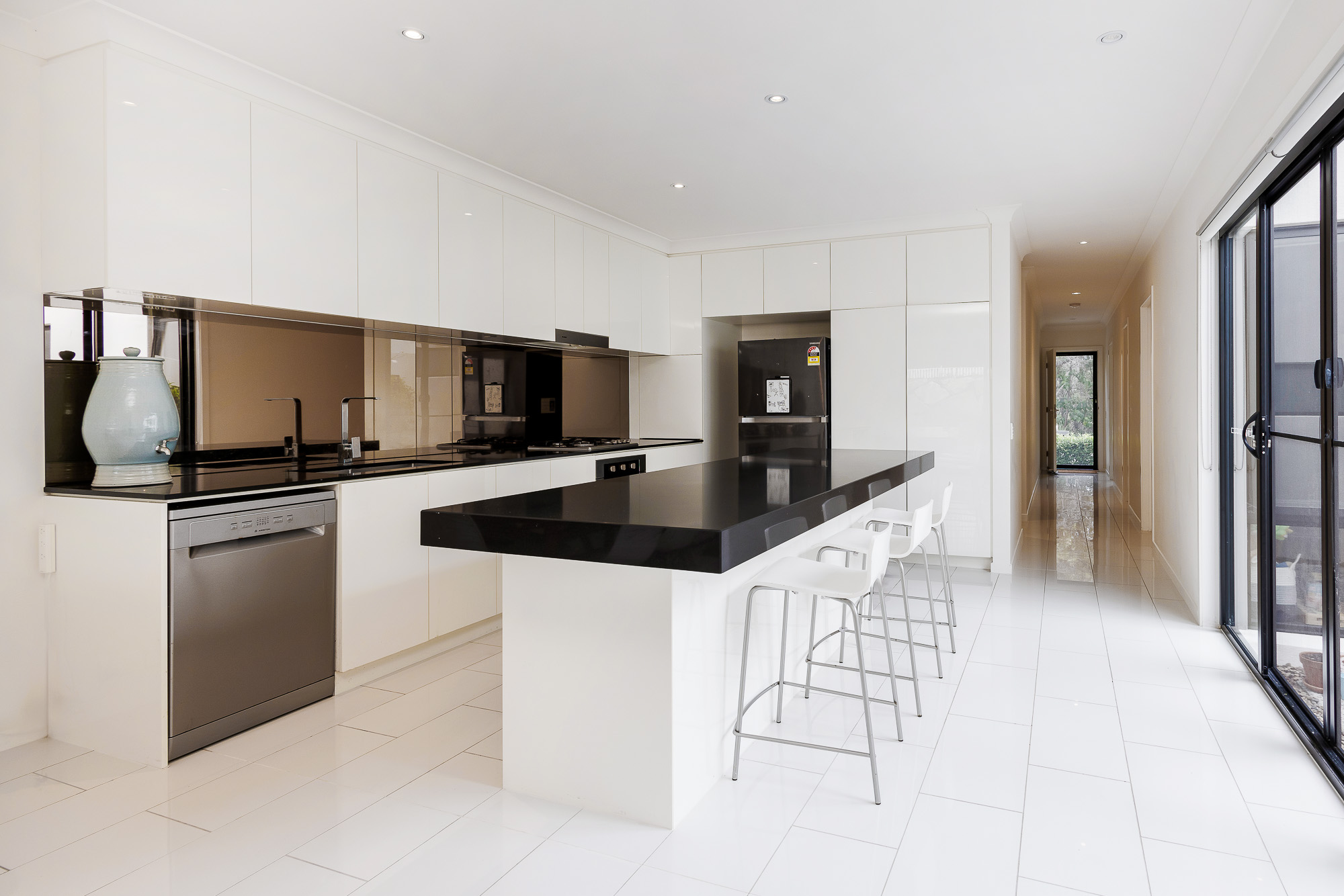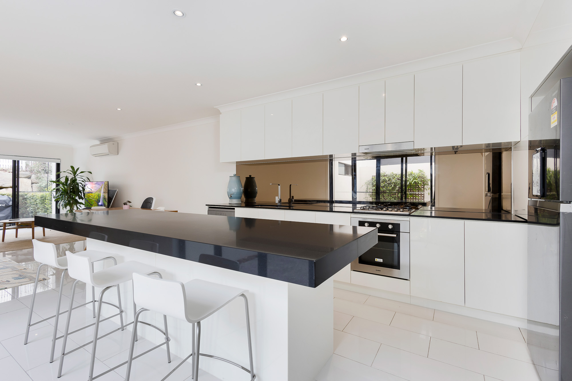 The kitchen, the heart of the home, is a masterpiece of contemporary design. Crisp white cabinetry contrasts beautifully with sleek black countertops, offering ample space for culinary creativity. Seamlessly placed off the kitchen, another light filled internal courtyard adding an additional layer of brightness and serenity to the home, making it the perfect spot an intimate alfresco meal.
