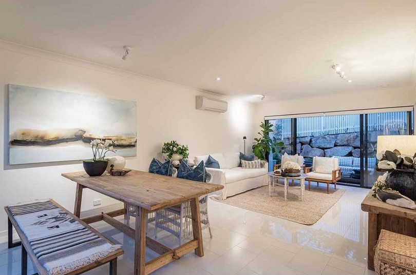 As you step through the entrance, you are immediately welcomed into a space that exudes elegance and tranquility. The open plan living and dining area is the epitome of modern sophistication, bathed in natural light that filters through the large sliding doors, leading out to a serene internal courtyard. This secluded oasis, encompassed by a lush rock wall filled with greenery, creates a perfect blend of indoor to outdoor living, inviting you to relax in your private retreat.